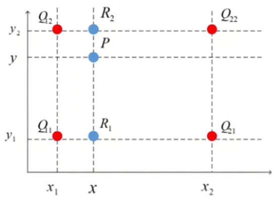 For the pixel points to be added, the pixel values of the four surrounding pixel points , , , and are , , , and , respectively. The bilinear interpolation algorithm first performs interpolation twice in the horizontal direction: