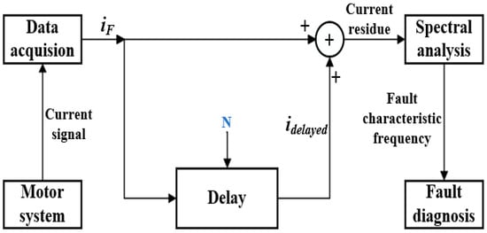 The time-shifting method is used to represent the supply fundamental and its odd multiple harmonics as an amount of N, resulting in the delayed current signals idelayed. Here, N is a numerical representation devised for convenience in development. In practice, the time-shifting method introduces a delay of a specific time interval, which is t and is equal to . The delayed current is then added to the current component iF and finally the residual current signal, which is further subjected to spectral analysis and fault characteristic diagnosis analysis; this approach is illustrated in Figure 1.