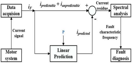 First, the stator current of a single phase in a three-phase motor is acquired through a data acquisition system to obtain the required current signal data. Similar to the LP method, the current component is divided into predictable and unpredictable components. The predictable components represent the noise that needs to be eliminated. However, in the FLP method, linear prediction involves utilizing the number of memory storage units denoted by m used as the count of predictor terms. Similar to P in the LP method, the introduction of the number of memory units, denoted as m, is used to predict the noise signal. For FLP models with restricted memory samples, only three values of m are utilized: 1, 2, and 3. Therefore, the corresponding count of memory samples is defined as the parameter M, which are 2, 3, and 4, respectively. On the other hand, for the FLP model with full memory, there is no restriction on the value of m. The predicted results are then subtracted from the two components of the original signal to obtain the residual signal. A frequency spectrum analysis of the residual signal is carried out to extract fault characteristics, as illustrated in Figure 3.