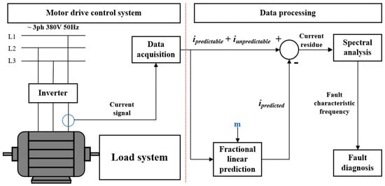 Based on the previous analysis, the FLP algorithm is applied to diagnose the bearing fault and eliminate the noise components in the current signal. This approach is employed to effectively extract characteristic components related to bearing faults and facilitate the analysis of bearing fault diagnosis. The framework of this method mainly consists of data acquisition, algorithm processing, and spectral analysis.