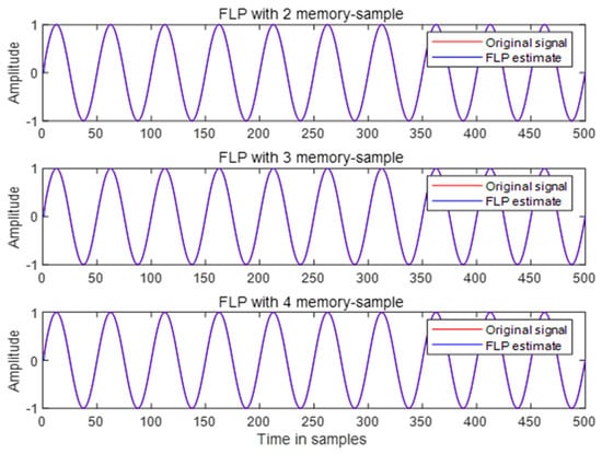 Next, the same sine wave signal is used for the simulation analysis on the full-memory FLP model. Unlike the FLP model with restricted memory samples, the full-memory FLP model is not constrained by a finite number of memory samples and is essentially similar to the LP model [38]. The results show that although the maximum achievable prediction gain value is comparable to that of the FLP model with restricted memory samples, optimization becomes complex when comparing with LP methods that have higher prediction order settings, as the corresponding order of the full-memory FLP model needs to be set with the same numerical values.