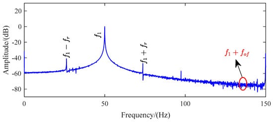 Before comparing the four methods for the faulty motor with an outer ring bearing fault, it is necessary first to compare the spectrum analysis of a healthy motor and a faulty motor under a heavy load. Figure 6 presents the FFT frequency spectrum analysis (0–150 Hz) of a healthy motor under a heavy load. The presence of the inherent eccentric harmonic component f1 ± fr, caused by the motor’s internal eccentricity, makes it difficult to observe the sideband fault frequencies.