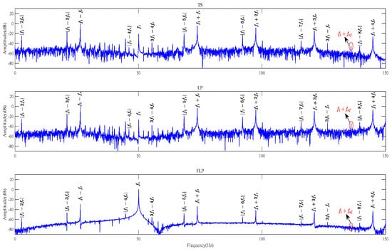 However, when the motor experiences outer-ring bearing faults, as shown in Figure 7, the characteristic frequencies associated with eccentricity faults become more prominent. In this case, while the sideband fault frequency |f1 – fof| may not be visible, f1 + fof can still be recognized. Based on the experimental findings, it is evident that the FLP method has a significant capability to eliminate noise. The interference component at the observable peaks corresponding to eccentricity harmonics is relatively reduced compared to the interference observed in the other two methods. In other words, the FLP method can effectively eliminate noise components and suppress irrelevant components. Only the fault characteristic frequency or harmonic components to be analyzed will be displayed on the graph. As a result, the FLP method exhibits a more significant and distinct efficacy in extracting the fault characteristic frequency and eccentric fault frequency.