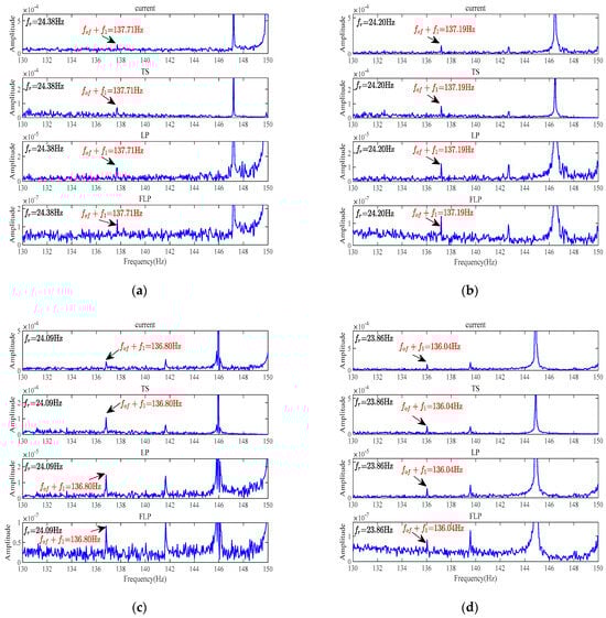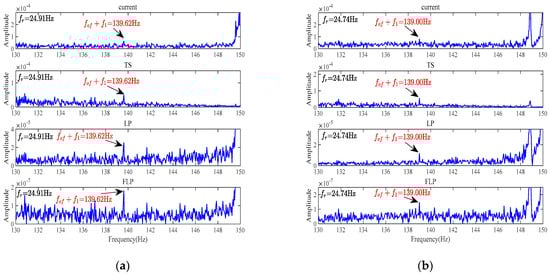 The frequency spectrum analysis of a faulty motor with the outer-ring bearing fault under light load conditions is shown in Figure 8. Under the light load conditions, it is noticeable that the performance of the frequency spectrum analysis using the raw current signal is observed, and the extraction of sideband fault characteristic frequencies is not effective due to the interference of noise. However, when analyzing the residual current using the TS, LP, and FLP methods, the extraction of sideband fault characteristic frequencies is improved, and the spectral line f1 + fof is visible. It can be observed from both Figure 8a,b, that the FLP method exhibits the most prominent spectral line f1 + fof, indicating that it is the most effective in extracting sideband fault characteristic frequencies. Additionally, it can be observed that the FLP method significantly reduces the overall noise level, with the lowest amplitude. Normally, under low load conditions, the performance of fault feature extraction is lower than under heavy load conditions. However, from the experimental results, it can be observed that the effect of bearing fault feature extraction using the FLP method is still very obvious compared to other methods. This also reflects the superiority of the FLP method.