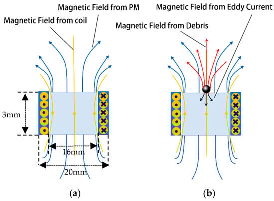 Schematic of magnetic field change in sensing unit: (a) No debris, the magnetic field is generated by magnetic and a coil. (b) Ferromagnetic wear debris, where the debris causes the magnetic field to change.