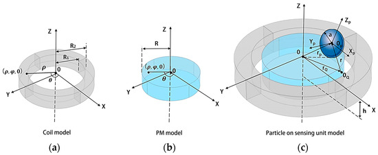 Coordinate system on sensing unit: (a) the model of the coil, (b) the model of the permanent magnet, and (c) the model of the particle on sensing unit model.
