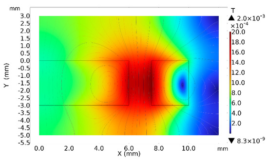 Before conducting the experiments, the magnetic field distribution of the pairs of sensors was first simulated using the COMSOL Multiphysics 5.4 finite-element analysis software to explore the relationship between the magnetic field and the change in position. The geometric model in the finite element analysis is consistent with Figure 3. Due to the symmetrical structure of the sensing unit, its flux density mode at the cross-section “Y = 0, X > 0” is shown in Figure 4. When the excitation signal of 10 V 100 kHz is applied to the sensor, the coil generates an alternating magnetic field, and the magnetic field density mode is the largest in the contact area between the coil and the magnet because the magnetic field at this position is the sum of the magnetic field of the coil and the magnet, which are superimposed on each other. Therefore, the magnetic field is higher than this location.