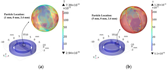 Effect of particle position on magnetic flux density: (a) particle position (1 mm, 0 mm, and 3.4 mm) and (b) particle position (5 mm, 0 mm, and 3.4 mm).