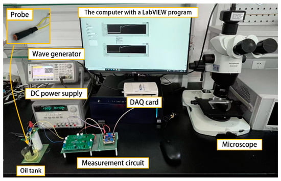 The experimental bench is shown in Figure 6. The experimental bench consists of a sensing unit, a waveform generator (KEYSIGHT 33600A Series, KEYSIGHT, Santa Rosa, CA, USA), an oscilloscope (Agilent Technologies MS071048, Agilent, Santa Clara, CA, USA), a microscope (Olympus Corporation SZX2-ZB10, Olympus Corporation, Tokyo, Japan), a DC power supply (Agilent E3631A, Agilent, USA), signal conditioning circuits, a computer with a LabView data acquisition unit (LabVIEW, National Instruments, Austin, TX, USA), and a data acquisition card (NI USB_6211, National Instruments, Austin, TX, USA). The waveform generator produces an AC excitation signal to drive the sensing unit, and the initial output signal of the sensor is an AC signal, which is not conducive to the extraction and collection of information; therefore, the signal is processed through the amplification circuit and filtering circuit to be converted into a DC signal, which is then read by the data acquisition card, the adsorption of particles is observed through a microscope, and the DC power supply provides power for the signal processing circuit.
