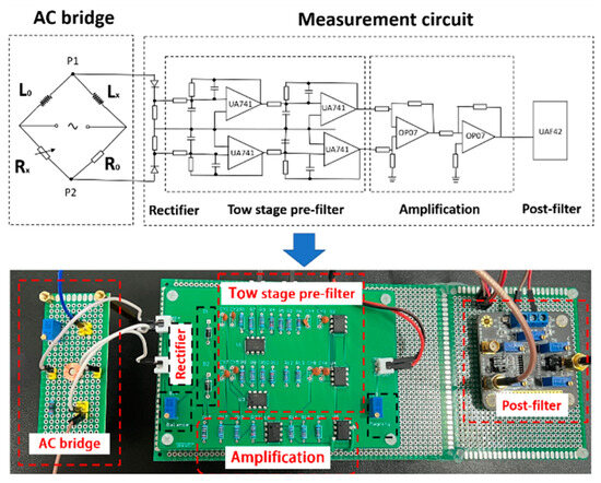 The measurement circuit is used to enhance and process the output signals of the sensor, as shown in Figure 7. The AC bridge is used to measure the inductance values Lx and L0. They are converted into voltage signals and processed by the measurement circuit. The AC voltages (Vx and V0) are rectified into pulsating DC signals by a half-wave rectifier circuit. The pulsating DC signal is filtered to DC by a pre-filter consisting of two filter stages. The difference (Vx − V0) is re-accepted by the differential amplifier circuit, which is the first stage of amplification. It is further amplified by a second stage of amplification. To further improve the signal-to-noise ratio, a post-filter is required. Theoretically, Rx and R0 are equal, so the AC bridge is balanced before testing. In practice, however, the environment affects the coil inductance, L0, and Lx, especially the temperature. Therefore, the potentiometer (Rx) is set to adjust the balance of the AC bridge.