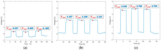 Experimental output results (Vout): (a) voltage detection results for 0.11 mg of iron particles, (b) voltage detection results for 0.33 mg iron particles, and (c) voltage detection results for 0.55 mg iron particles.