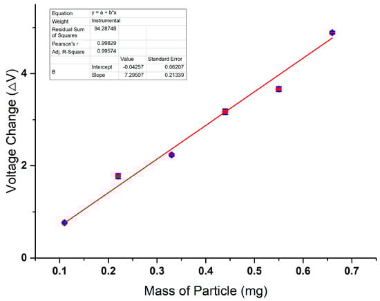 The particle-induced voltage change (ΔV) in the sensor is shown in Figure 9. Compared to the Vout value, the ΔV value is unaffected by the fundamental voltage fluctuations and provides a more accurate representation of the particle mass. The error bars are derived from the data of three replicate experiments. There is a positive correlation between the particle mass and the voltage signal.