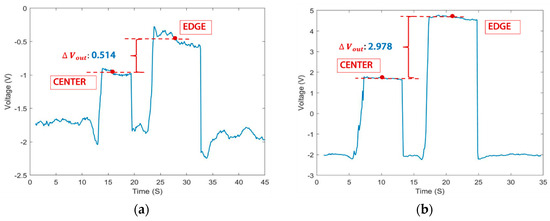 The experimental manipulation controlled the attraction of metal particles to different regions (center or edge) of the sensor. The voltage signal output from the sensor is shown in Figure 10. Different particle positions result in differences in voltage output (ΔVout). Figure 10a shows that the voltage signal at the edge of a 0.22 mg particle is 0.514 volts, which is greater compared to when the particle is at the center. In Figure 10b, 0.55 mg of particles at different locations results in a voltage change of 2.978 volts. The results show that the edge detection region of the sensor is more sensitive than the center detection region, and the larger the particle size, the greater the change in signal. The main reason for this phenomenon is that the magnetic field density at the edge of the probe is much higher than that at the center. Therefore, when analyzing the particle concentration, the difference in the captured particle position will lead to signal deviations, which also indicates that the magnetic field inhomogeneity and the reasonableness of the layout of the detection position should be fully considered when carrying out the sensor design.