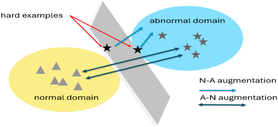 Illustration of the fundamental concept behind the two augmentations introduced in this study. The “hard examples” represent data points that lead to errors and diminish the overall accuracy. These challenging instances often reside at the interface between the normal domain and the anomalies domain, creating a classification hurdle along the discriminatory plane. To mitigate this issue, we propose two augmentations: N-A augmentation, which involves displacing anomalies towards the normal distribution, and A-N augmentation, which focuses on shifting data from the normal distribution toward the anomalies domain. These strategic augmentations are aimed at refining the classification process, particularly in handling “hard examples”.