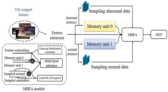 In this section, we propose an effective method for utilizing a memory unit in the multiple instance learning (MIL) framework. The research aims to enhance discriminative performance by leveraging information extracted not only from the conventional feature embedding but also from the memory unit, along with sampled normal and abnormal clips using the introduced memory-highlighted feature aggregation (MHFA) module. This approach is trained using the BCE loss, latent loss, and KL loss, which constitute the model to be introduced. Therefore, in this study, we present an augmentation process suitable for the memory MIL framework, anticipating performance improvement through the design of corresponding loss functions. The MHFA module is proposed to demonstrate efficient integration in the augmentation process. This approach can be applied to other modules within the existing framework, with the expectation of enhancing overall performance. In an overview of Figure 2, the proposed model has a structure that produces output through four sub-modules. The I3D-RGB cropped feature is used as input, the anomaly score is finally calculated as the output, and extraction is performed by passing the I3D-RGB cropped feature through a transformer structure. In addition, it is divided into normal instances and abnormal instances using video labels, passes through each sampled unit and memory unit, and merges them with existing features into a multi-head attention structure in the MHFA module to produce the final score.