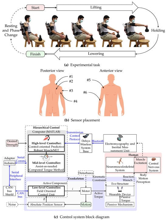 (a) The subject is doing a weight-lifting exercise in the sagittal plane while wearing the exoskeleton and sensors; (b) the placement of wireless sEMG-IMU sensors to the skin at sites of #1 UTRA, #2 MTRA, #3 MDEL, #4 PDEL, #5 ADEL, and #6 BRD located on the right forearm, shoulder, and upper trunk musculature; and (c) block diagram showcasing the primary components of the control system and the connection protocols utilized [].