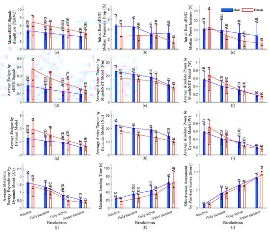 The sex impact and quantitative evaluation values for the four exoskeleton actuation types (IE, FP, FA, and AP). (a–l) are Measure 1–Measure 12; note that the median (.), the STD, and the Tukey honestly significant difference (Tukey HSD) letters are shown on top of all participants STDs for same-sex type (bar charts).