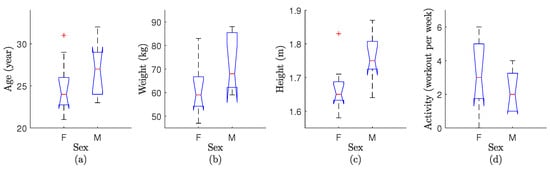 Depiction of a one-way analysis of variance conducted on the sample data of F: female versus M: male participants, with respect to their (a) age, (b) weight, (c) height, and (d) activity. Notably, the figure highlights an outlier through a red plus sign, while the median is represented by a red bar at the center. The minimum and maximum values are denoted by black minus signs at the bottom and top, respectively, and the 25th and 75th percentile values are enclosed within a blue bounding box.