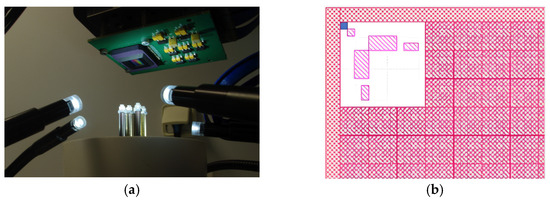 A photo of the mounted hybrid sensor under microscope is presented in Figure 9. A mosaic of the MSFA is magnified for verification of the structure and pixels (Figure 9a). Figure 9b presents a zoom-in of image acquired with the one-shot VIS MS camera. Figure 10 illustrates the spectral sensitivity of the MS image sensor. The lowest filter responses were found at 425 nm and 885 nm for the VIS and NIR MSFAs, respectively.