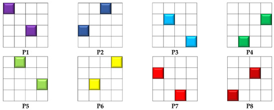 Each monochrome image taken by the cameras consisted of data on 8 single-band planes. The demosaicking procedure refers to the extraction and reconstruction of an MS image consisting of eight single-band images (i.e., an image cube of eight layers). The demosaicking algorithm read the monochrome image, took each mosaic of the image, completed the missing pixels, and produced an image of the same size. Figure 5 illustrates the architecture of a single mosaic and how two pixels were attributed to each filter. These masks were repeated Nl and Nc times along lines and columns of the image to cover the entire image.
