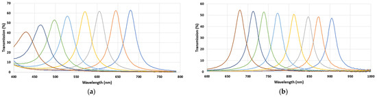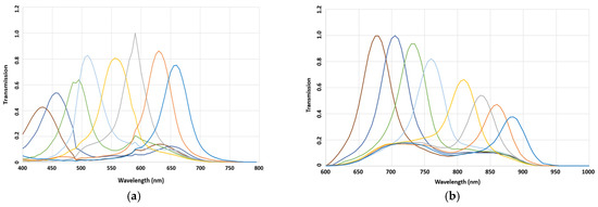 Figure 7 illustrates the spectral sensitivities of the chosen filters after fabrication. This figure presents the relative sensitivities of each filter. It can be seen that the transmission rates of all bands were over 40%, and very good consistency was observed for the primary prototypes.