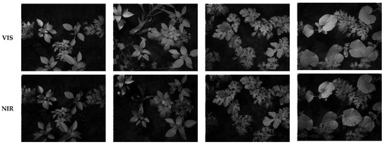 Figure 11 presents some of the images taken by the cameras from several plants. The VIS and NIR images were taken at the same time for the same scenes. These images are the raw images, which include eight single-band images to be extracted by demosaicking. The illumination used for these images consisted of three halogen lights. This illumination was chosen to provide enough energy for both VIS and NIR. Shrestha et al. [51] used a 3D camera with two sensors for an MS camera by using MS filters in front of the image sensors. In a recent study, Zhang et al. [52] developed an MS camera for the visible range. The camera was designed to be compact, handheld, and of high spatial resolution.