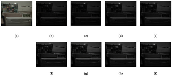 Figure 12 provides an image of a scene with a standard color checker. In this figure, (a) represents a color image built using one of the multispectral cameras, and the rest are eight bands of the VIS MS camera. In this figure, (b)–(i) are images that have been reconstructed by the demosaicking algorithm.