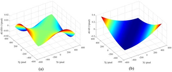 With f = 25.6 mm, −3.3 mm 3.3 mm, and a pixel size d = 6.45 m, the relationship between , and , can be obtained, as shown in Figure 2.