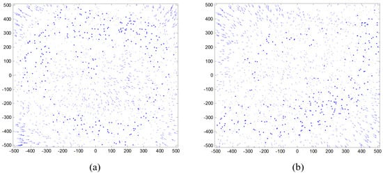 Star images were projected on the image plane with the calibration results. By comparing the centroids of the projected star images and the real values, residual error vectors were obtained and their distributions are shown in Figure 5a,b. In the center of the image plane, the vector direction is in disorder and the vector length is small, indicating that the accuracy of the calibration results in these areas is relatively high. In the four corners (top-left, top-right, bottom-left, and bottom-right) of the image plane, the vector directions are more regular and the vector lengths are longer, indicating that the residuals are larger at these positions, especially in the four corners in Figure 5a. Figure 5b, on the other hand, has larger residuals in the top-left and bottom-right corners. The statistical results show that the root mean square (RMS) value of the residuals of the calibration results using the IAICM method in Figure 5a was (0.0115, 0.0115) pixels, while the RMS value of the residuals of the calibration results using the ACFCM method in Figure 5b was (0.0057, 0.0055) pixels. It is clear that the residuals using the ACFCM are only about half that of those obtained with the IAICM method, indicating that the calibration accuracy of the ACFCM method was much better.