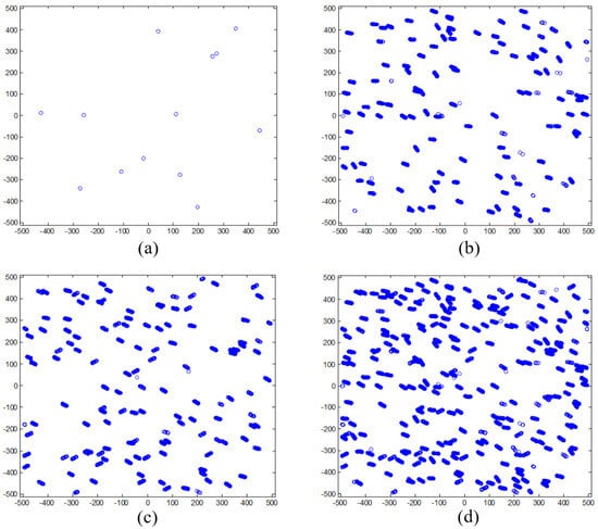 Star image distribution before and after employing the ACFCM for different groups: (a) star image distribution for a single-star frame; (b) the star image distribution for the first calibration group; (c) the second calibration group; and (d) the third calibration group.