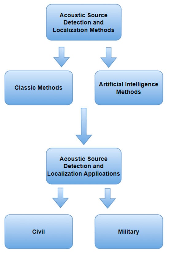 The paper is organized as follows: Section 2 contains a classification of sound source detection and localization methods and presents the taxonomy proposed in the review. Then, Section 3 presents a detailed overview of the methods according to the division proposed in the previous chapter. Section 4 presents military and civilian applications proposed in the literature, and Section 5 deals with future trends in the proposed topic. Finally, Section 6 presents the conclusions of the review.