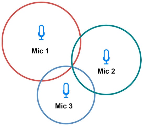 Figure 5. Two-dimensional trilateration schema. - Multilateration—Used to determine the localization based on four or more microphones. The principle of operation is identical to trilateration. Using more reference points allows for a more accurate determination of the localization because, with their help, measurement errors can be compensated. However, this results in greater complexity and computational requirements. Despite this increased intricacy, the accuracy and error mitigation benefits make multilateration a crucial technique in applications where precise localization determination is paramount [53].