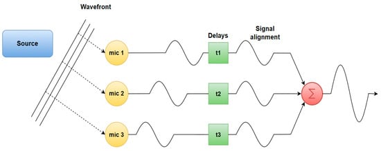 Figure 6. Delay and sum basic idea. - Minimum Variance Distortion-less Response (MVDR)—A beamforming-based algorithm that introduces a compromise between reverberation and background noise. It evaluates the power of the received signal in all possible directions. MVDR sets the beamformer gain to be 1 in the direction of the desired signal, effectively enhancing its reception. This step allows the algorithm to focus on the primary signal of interest. By dynamically optimizing beamforming coefficients, MVDR enhances the discernibility of target signals while diminishing unwanted acoustic components. It provides higher resolution than DAM and LMS methods [80].