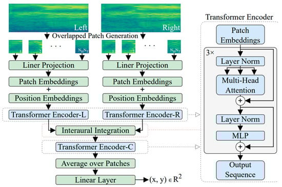 A dual-input hierarchical architecture is utilized to simulate the human subcortical auditory pathway. The spectrogram is initially divided into overlapping patches, which help capture more context from input data. Each patch undergoes a linear projection to transform its features to learn appropriate representations for each patch. The resulting linearly projected patches are then embedded into a vector space, and position embeddings are added to capture temporal relationships of the spectrogram in the Transformer. These embeddings are fed into a transformer encoder, which employs multi-head attention to capture both local and global dependencies within the spectrogram data. Following the transformer encoder, there is an interaural integration step, where two instances of the aforementioned architecture process the left and right channel spectrograms independently. The outputs from the two channels are integrated and fed into another transformer encoder to process the features together to produce the final results as sound localization coordinates. Results show that the attention-based model leads to significant azimuth improvement compared to CNN-based methods. Another interesting approach was used for robotics’ sound source localization in [116]. The authors used Generalized Cross-Correlation with Phase Transform and Speech Mask (GCC-PHAT-SM) as an input feature, which significantly outperformed the traditional GCC feature in noisy and reverberant acoustic environments.