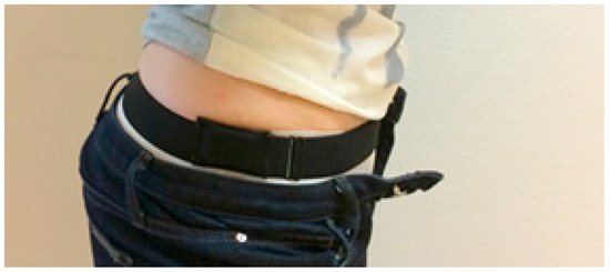 The placement of the accelerometer at the level of the iliac crest on an elastic hip-band.
