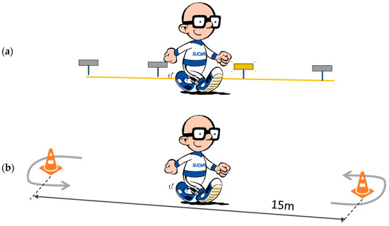 Illustration of the walking tests: (a) in the constant speed (CS) test, the participants were asked to follow the pace set by an advancing light source on a 200 m track; (b) in the acceleration/deceleration (AC/DC) test, the participants were asked to walk back and forth around the plastic cones on a 15 m track as fast as possible.