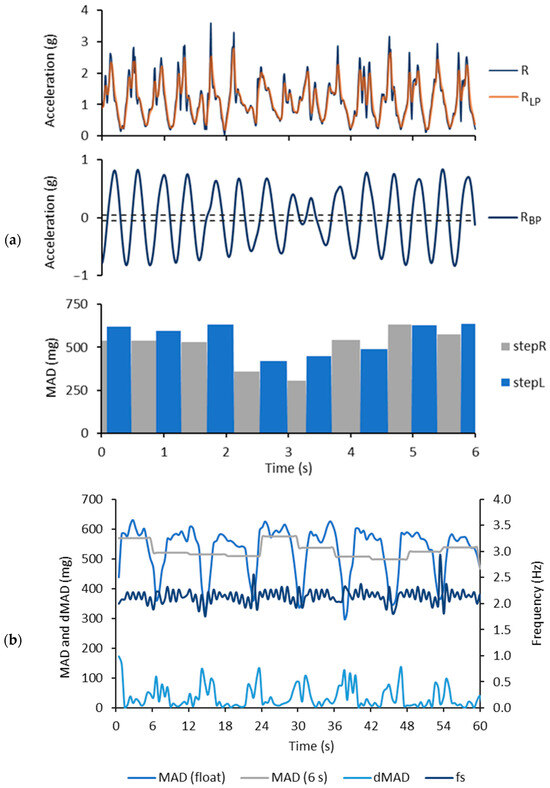 Example of measured and calculated parameter values during the AC/DC test: (a) The upper row shows the magnitude of the acceleration (R) and low-pass filtered acceleration (RLP) during the 6 s time containing one turn. The middle row shows the band-pass filtered acceleration (RBP). The dashed lines show the rising and falling edge thresholds for detecting the positive and negative crossings. The bottom row shows the mean amplitude deviation (MAD) value of each step. (b) The curves show the floating and 6 s epoch MAD values, change in the MAD-values between two adjacent floating epochs (dMAD) and step frequency (fs) during a 60 s time.