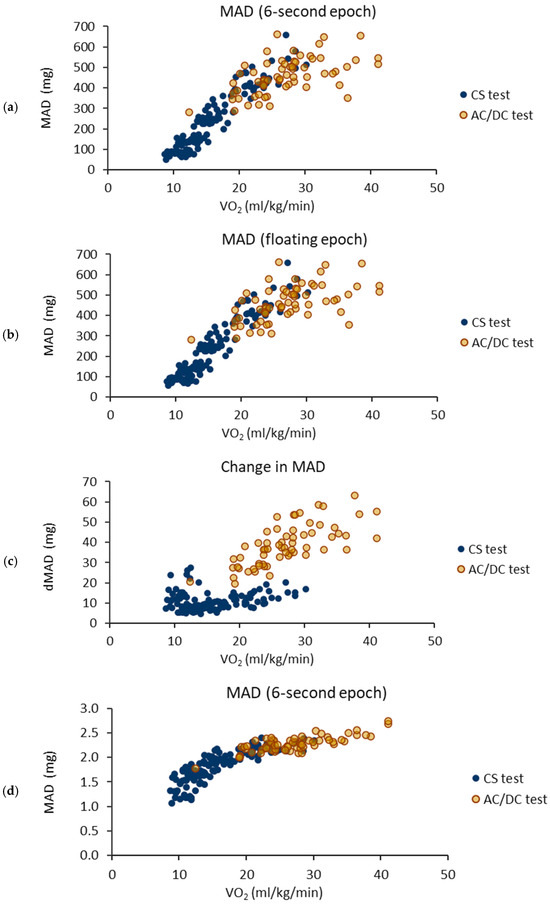 Figure 4 illustrates the relationships between the measured VO2 and calculated parameters. The MAD values of the AC/DC test (6 s and floating epoch) tend to be smaller than the values of the CS test for VO2 values greater than 20 mL/kg/min. The dMAD values of the AC/DC test were higher than the values of the CS test.
