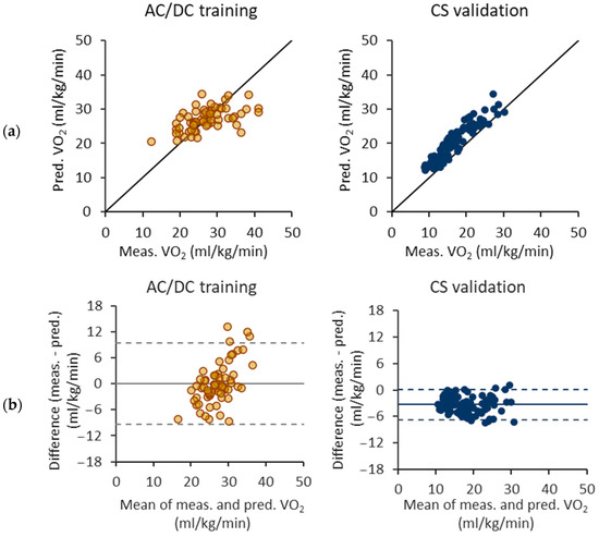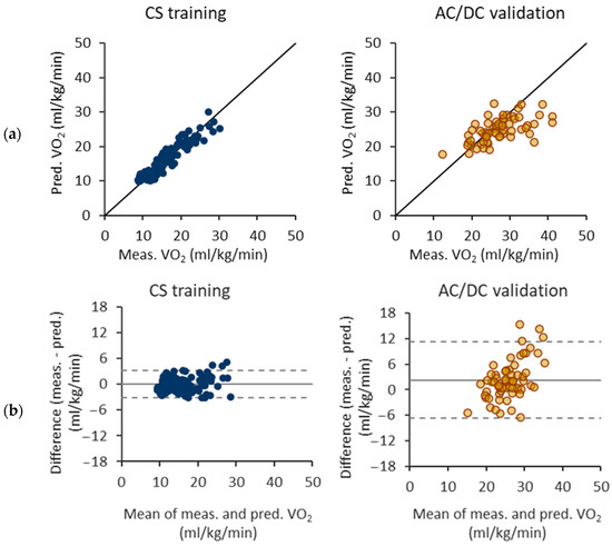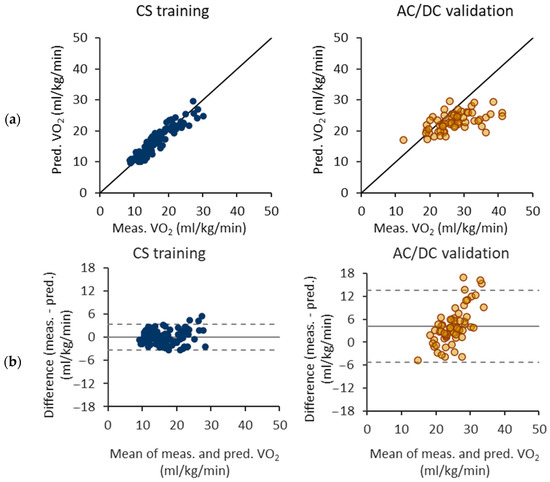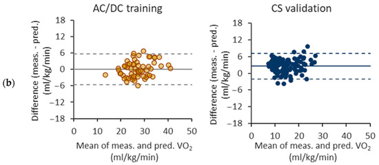 Performance of oxygen consumption (VO2) prediction equations trained with the floating epochs and acceleration/deceleration (AC/DC) test. (a) Measured and predicted VO2 for AC/DC test as a training set and constant speed (CS) test as a validation set. (b) Respective Bland–Altman difference plots of measured and predicted VO2 values. The solid line represents the mean difference and the dashed lines the 95% limits of agreement.