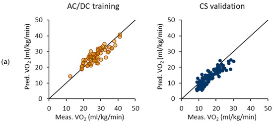 Table 2 presents the VO2 prediction equations derived from the 6 s epoch data. Notably, the equation developed using the CS test demonstrated high predictive accuracy when applied to the CS test data but performed poorly when applied to the AC/DC test data. Conversely, the equation generated from the AC/DC test exhibited high predictive accuracy for the CS test data but performed poorly when applied to the AC/DC test data.