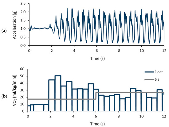 Illustration of a 12 s period containing a change in activity from standing to walking: (a) the magnitude of the measured acceleration; and (b) predicted oxygen consumptions using the floating epoch and 6 s epochs.