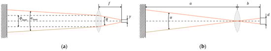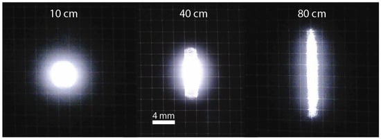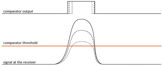 Figure 15. It can be seen that, depending on the set distance (a–g), the reflected light is coupled to the receiver through different light paths. The light path through the central mirror, which is the one through which the light pulse is transmitted, is always present, but the light path through the left and right mirror is only present on some set distances.