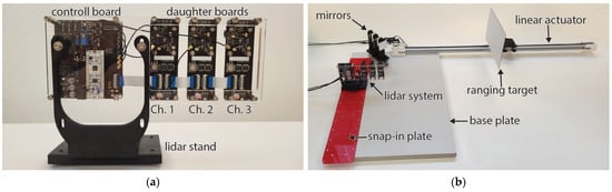 In direct ranging, and even when ranging through one clean mirror, the presented lidar’s ranging measurement error is safely within the ±1 cm range, and the measurement’s standard deviation was measured to be around 12 mm, as long as the set distance is within the calibrated range. That is with nothing but walk error correction. The theoretical maximum throughput of the developed lidar ranging system is 10 kHz, split among all channels, which was limited to 500 Hz due to the limitations of the current implementation. Using a faster microcontroller and better optimized code would allow for the use of the full sample rate, where averaging multiple samples or utilizing the running average would be very feasible. A running average of four samples effectively halves the measurement’s standard deviation, while using eight samples drops it safely below 4 mm, as seen in