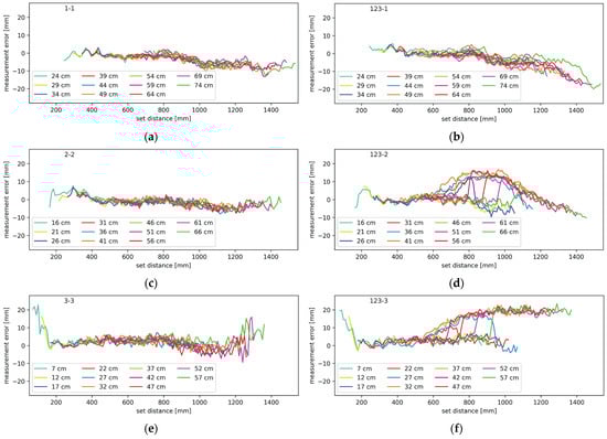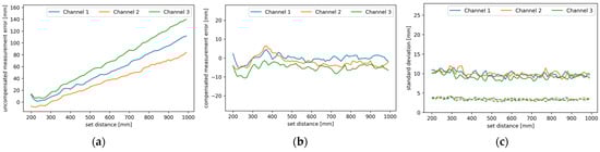 Figure 10a, where the average uncompensated measurement error is plotted against the set distance. The blue, orange, and red traces correspond to channels one, two, and three, respectively, and all the axes are in mm. Using walk error compensation, as presented in the Methods section, lowers the measurement error to that shown in