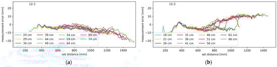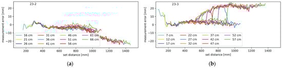 Figure 14a,b, respectively. Again, the average measurement error is plotted against the set distance; the different traces correspond to the different minimum distances between the lidar and the mirrors. The results are very similar to those from the tests with only one mirror present.