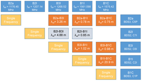 The different Beidou meta-signal combinations considered in this paper are briefly summarised in Figure 2, which also provides the resulting wide-lane wavelengths used for the reconstruction of high-accuracy pseudoranges.