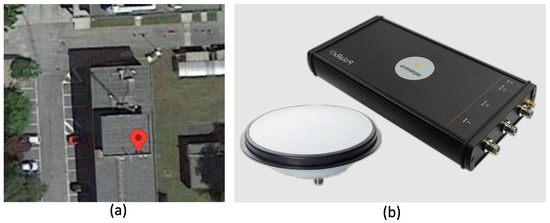 Experimental setup adopted for the analysis of synthetic Beidou meta-signal observations. (a) View of the location of the static antenna used for data collection. (b) Receiver and antenna used for data collection.