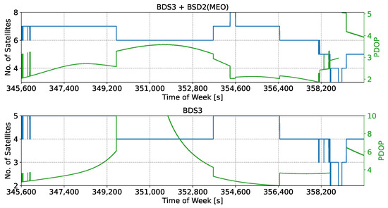 While the signals were collected under a clear-sky environment, different geometric conditions were obtained depending on the signal combination considered. The availability conditions are analysed in Figure 4, which shows the number of satellites used in the PVT and the corresponding Position Dilution of Precision (PDOP). Two cases are analysed in Figure 4; the best visibility/availability scenario is considered in the upper box of the figure. It was obtained considering signals from both the BDS-2 Medium Earth Orbit (MEO) and BDS-3 satellites. This is, for instance, the case for the B3I/B1I combination, as the two underlying signals were broadcast from both types of satellites, leading to a higher availability. In this case, up to eight satellites were available for computing the final position solution. The corresponding PDOP was practically always lower than 5.