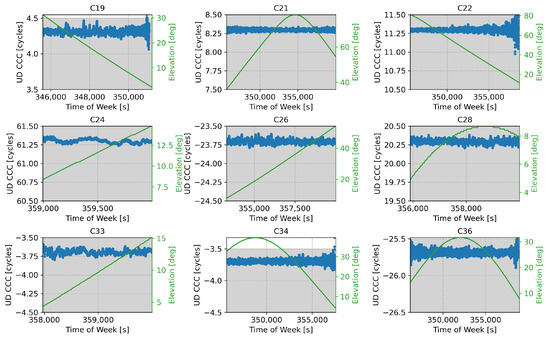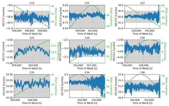 UD code-carrier combinations used in the ambiguity resolution process for the different satellites broadcasting both B3I and B1C signals, expressed in cycle counts. The corresponding satellite elevation is also provided in green.