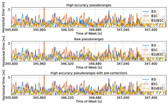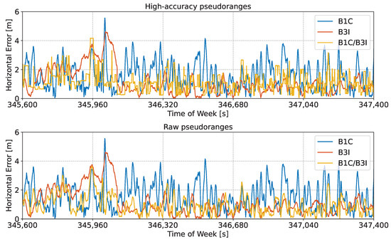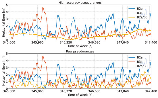 The figure shows the time evolution of the horizontal error obtained using an SPP solution for the different meta-signal measurements obtained using the B3I and B1C signals. In this case, the high-accuracy pseudoranges did not lead to a significant improvement with respect to the best single side-band solution, which was obtained for the B3I signal. Jumps and discontinuities can be clearly seen in the horizontal errors of the navigation solution obtained using the high-accuracy pseudoranges and depicted in the upper part of Figure 18. Similar results were obtained for the vertical channel and are not repeated here.